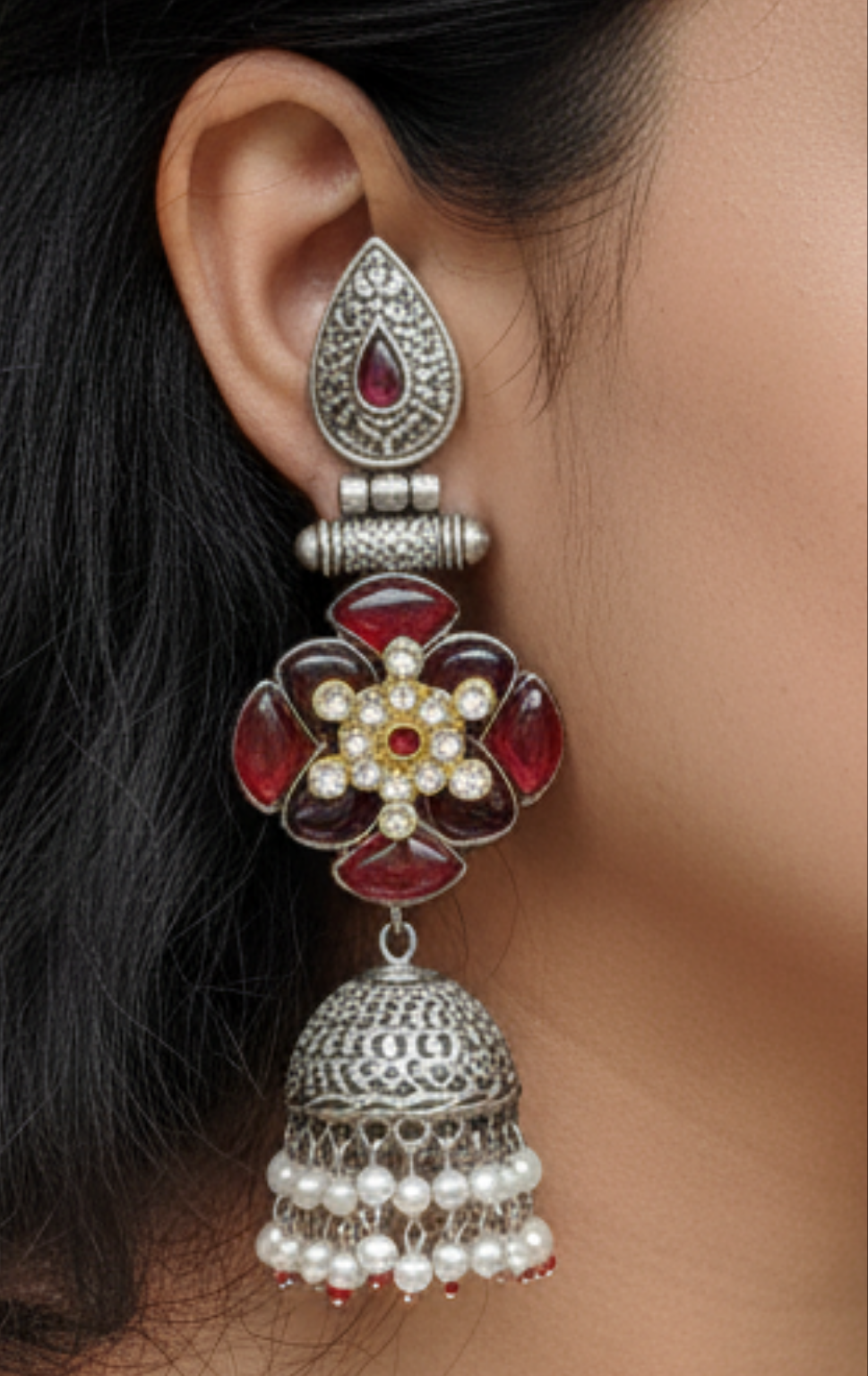 The NASH MAROON JHUMKA is a stunning accessory for any outfit. Crafted with a silver...