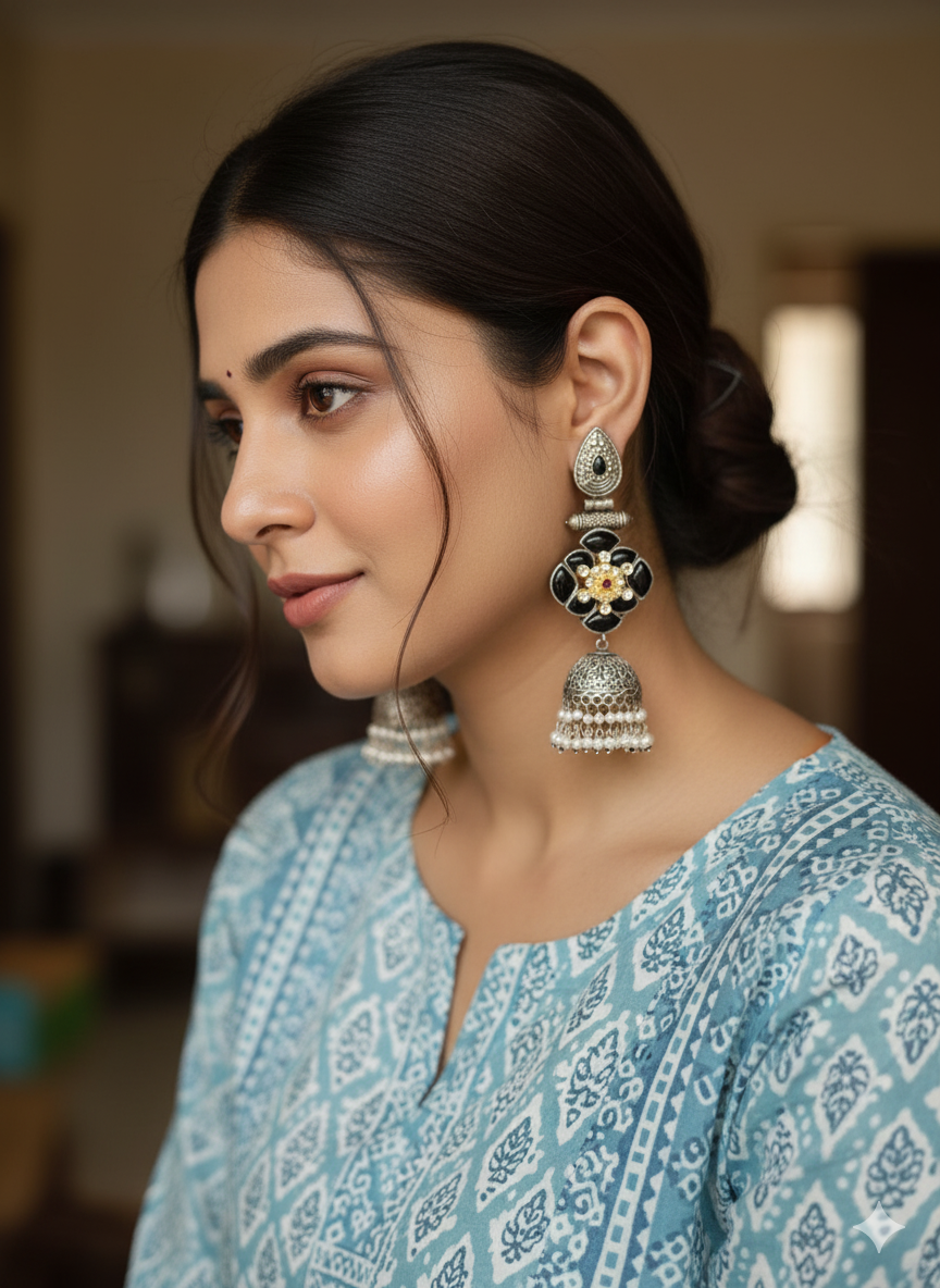 Crafted from high-quality silver replica brass, these elegant BLACK JHUMKA earrings are the perfect addition...