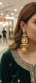 Handcrafted with brass and adorned with elegant mother of pearls, the Amisha Jhumka earrings exude sophistication and charm. The perfect accessory for any occasion, these jhumkis are sure to add a touch of timeless beauty to your ensemble. Elevate your style with these exquisite earrings.