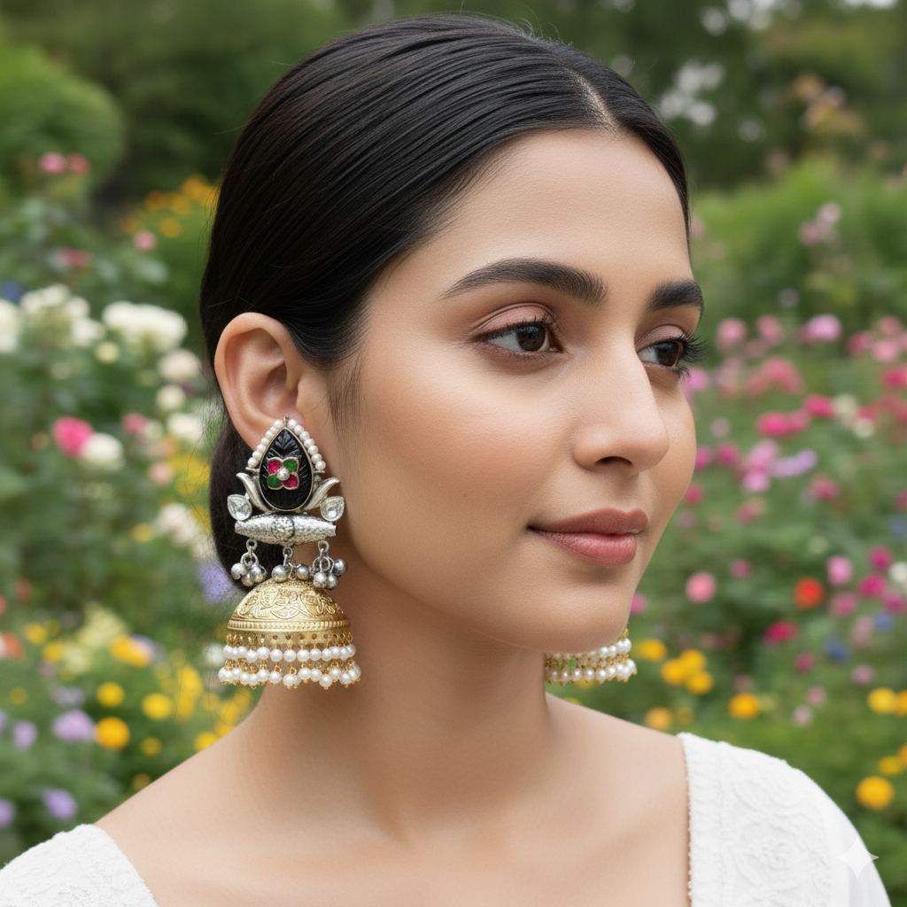 "Featuring traditional designs and intricate detailing, the YASHIKA BLACK JHUMKA is a must-have accessory for any cultural or festive occasion. Its timeless charm and elegant craftsmanship make it the perfect addition to your jewelry collection. Made of high-quality materials, these jhumkas are durable and comfortable to wear, allowing you to showcase your unique style with confidence."